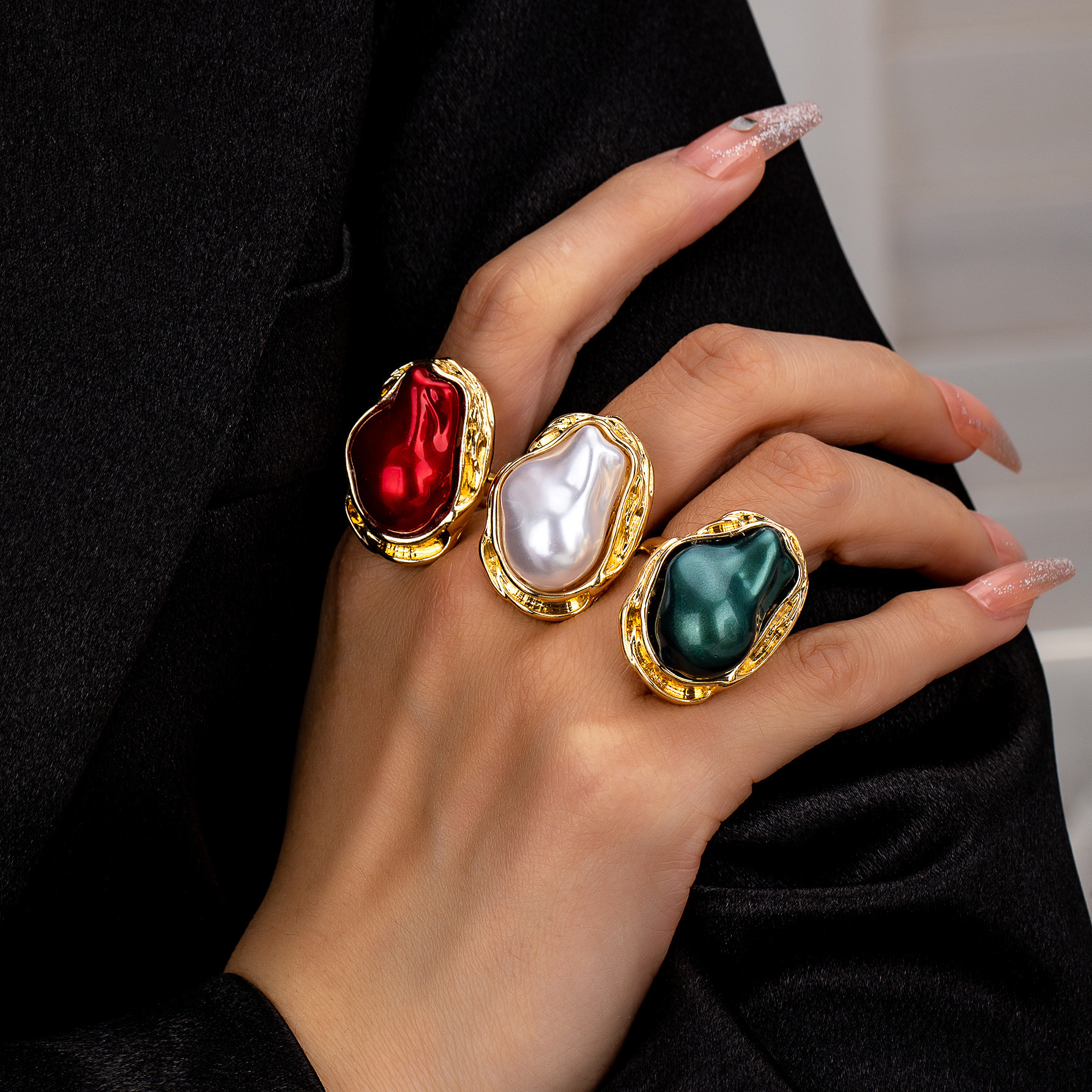 Three-Piece Set of Acrylic Pearl Ring Set for Women, French Retro High-End Design Niche Index Finger Ring