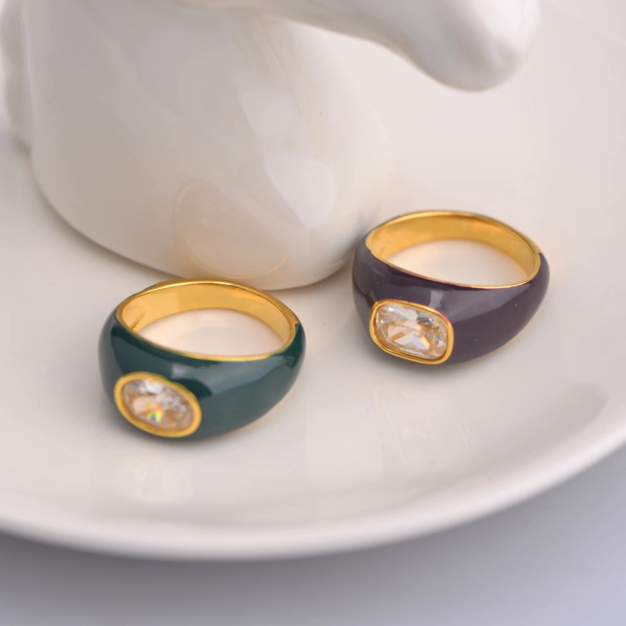 European and American INS style green round diamond Curry color square diamond ring fashion personality stainless steel plated 18K gold trend jewelry