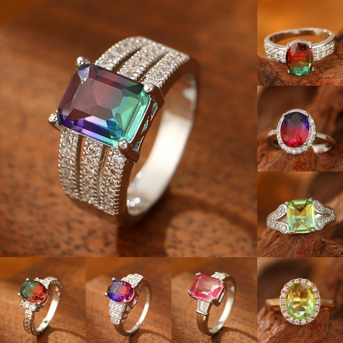Cross-Border New Product Zircon Ring Purple Green Gradient Crystal Wide Ring Ring Sparkling Full Diamond Tourmaline Women's Hand Jewelry