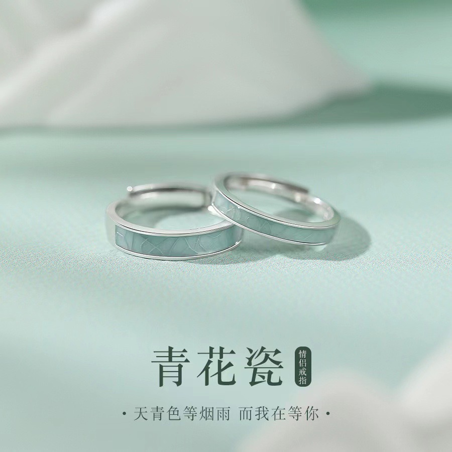 Blue and White Porcelain Couple Ring Men and Women Ins Niche Design Simple Fashion High-end Green Enamel Open Ring