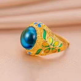 Imitation Vietnamese Sand Gold Enamel Butterfly and Flower Ring for Women, Ethnic Style with Gemstones, Adjustable Trendy Ring Wholesale