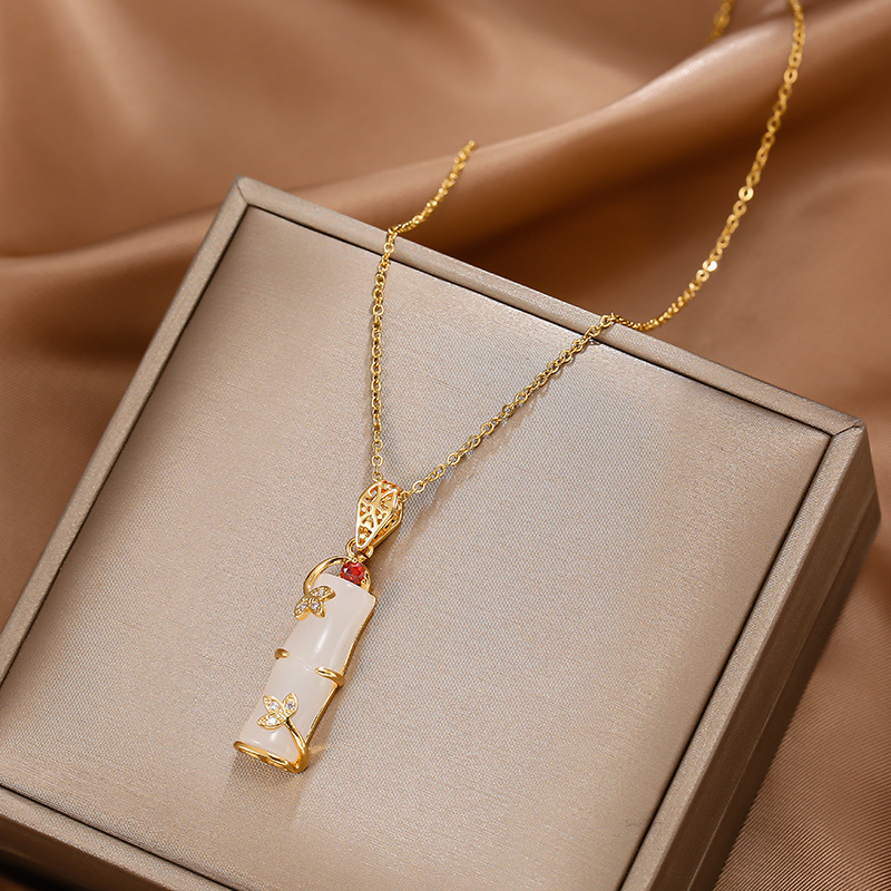 White Imitation Jade 18k Gold Plated Simple Bamboo Pendant Titanium Steel Necklace Women's Ins Personality Rising Blessing Neck Chain
