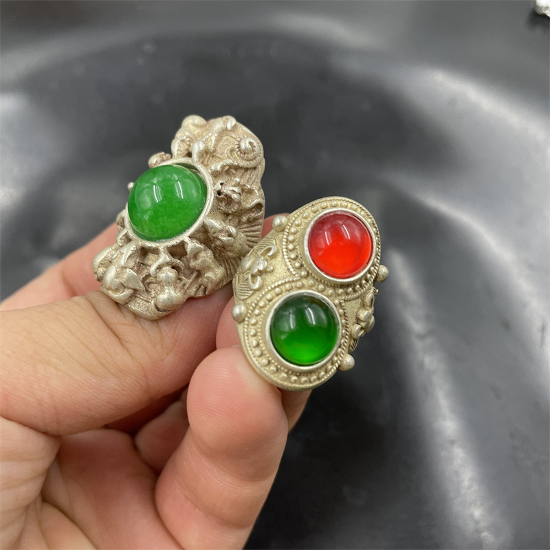 Cheap Jade Xizang Retro Old Xizang Silver Details Green Jade Ring Red Green Double-Sided Jade Ring