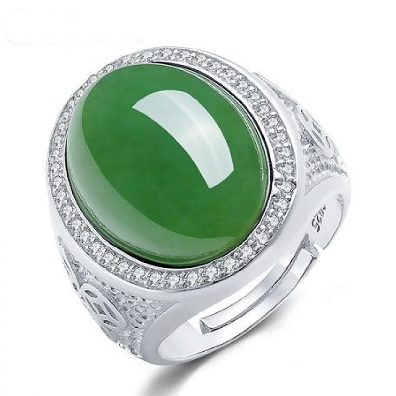 Celebrity Oval Egg Face Coin Ring Imitation Hetian Jade Inlaid Coin Inlaid with Diamonds Jade Spinach Green Ring
