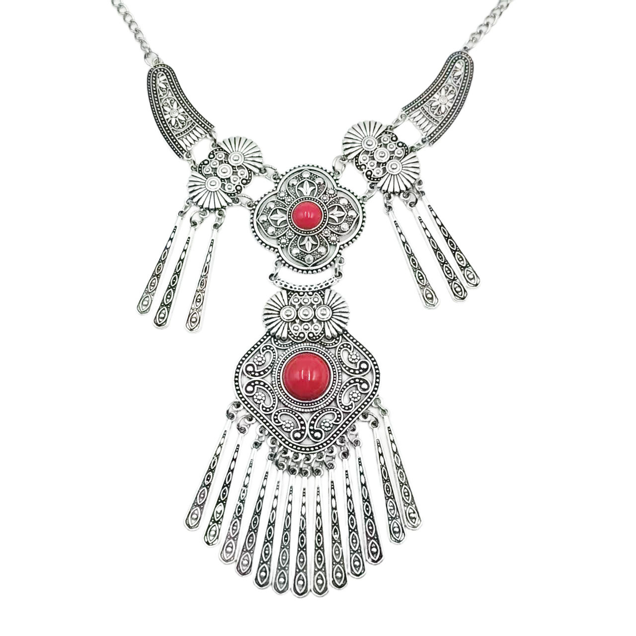 European and American Hot-Selling Bohemian Ethnic Style Necklace Alloy Retro Imitation Turquoise Leaf Tassel Pendant Sweater Chain