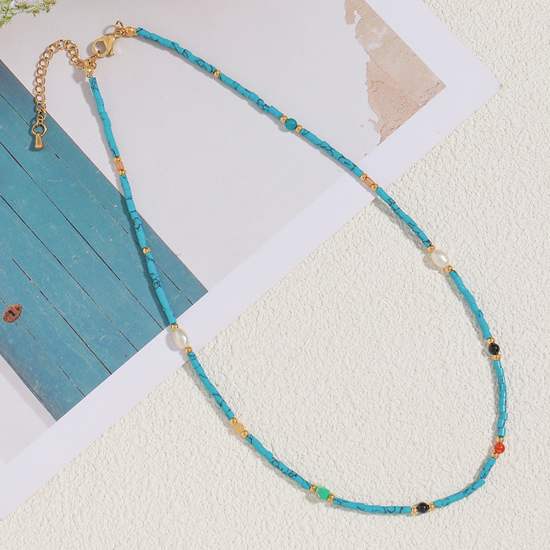 European and American Hot-Selling Contrasting Natural Blue-Green Turquoise Hand-Beaded Necklace Women's Niche French High-End Clavicle Chain