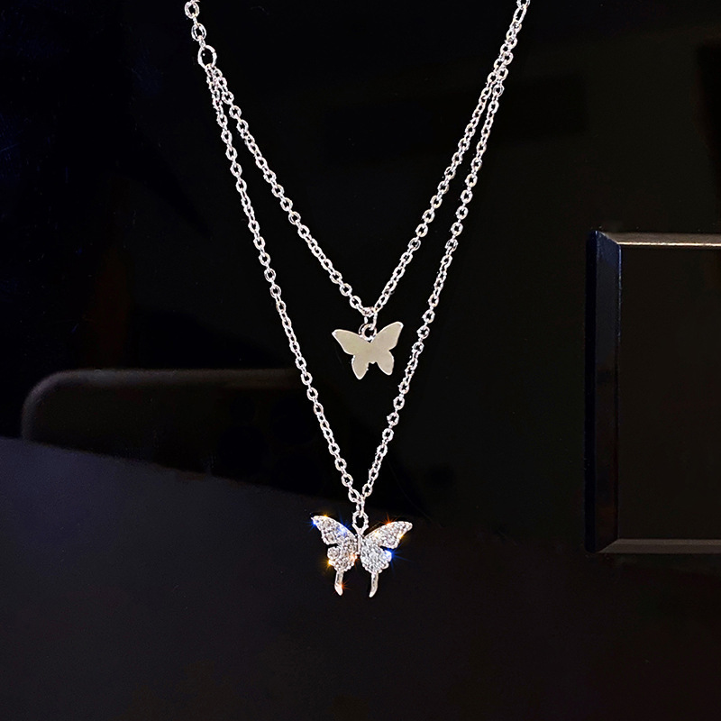 Japanese and Korean New Double-Layer Flash Diamond Butterfly Necklace Women's Simple Temperament Cold Style Clavicle Chain Necklace Factory Price Wholesale