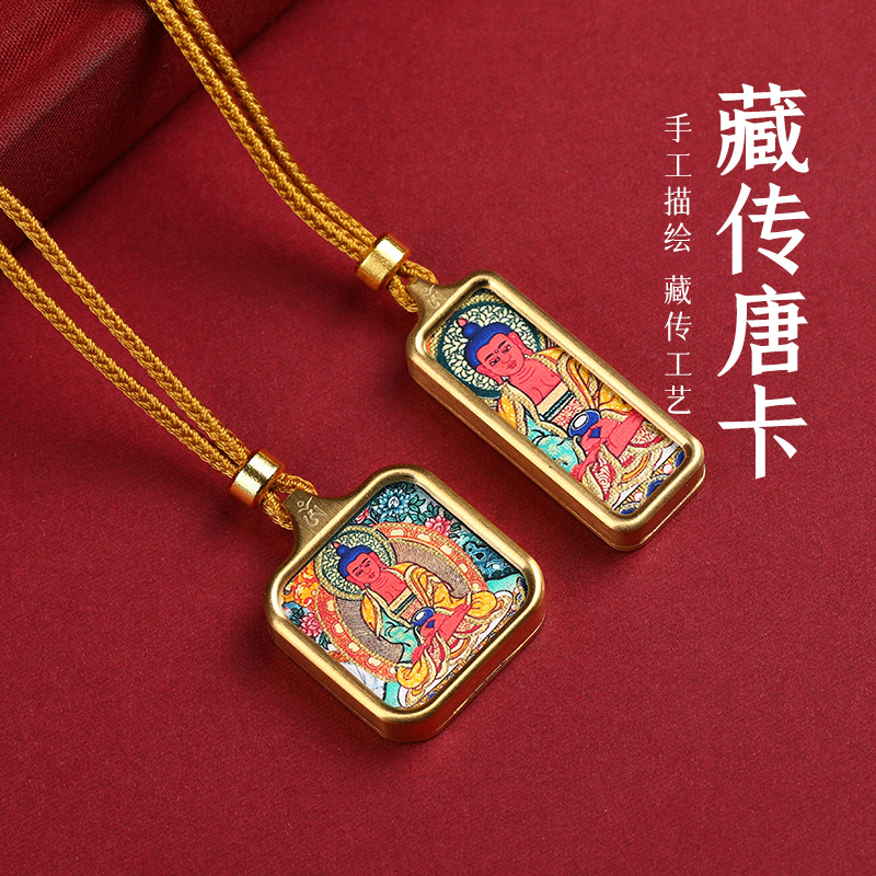 Xizang Handmade Colored Gold Thangka Pendant Green Mother Pharmacist Buddha Past Life and Present Life Painted Thangka Pendant Necklace