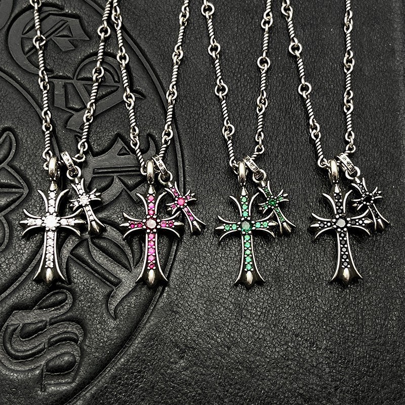 Trendy Thai Silver Retro Diamond-Encrusted Large and Small Double Cross Pendant Necklace Bamboo Chain High-End Autumn and Winter Sweater Chain
