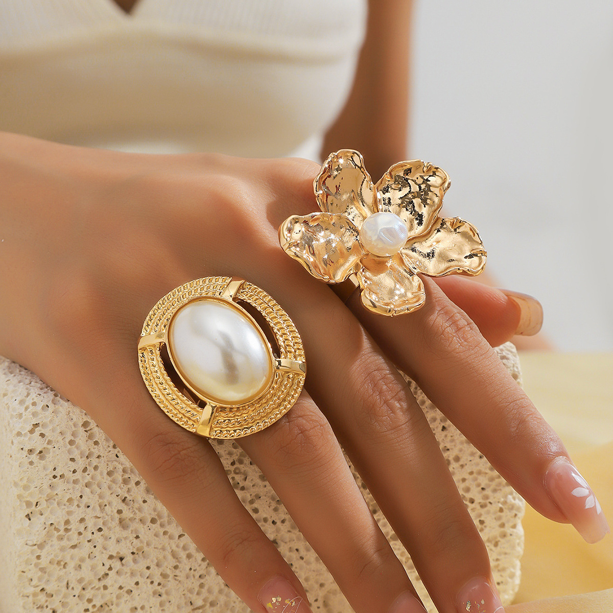 European and American Exaggerated Metal High-end Pearl Flower Inlaid Female Niche Design Ins Cold Style Retro Ring