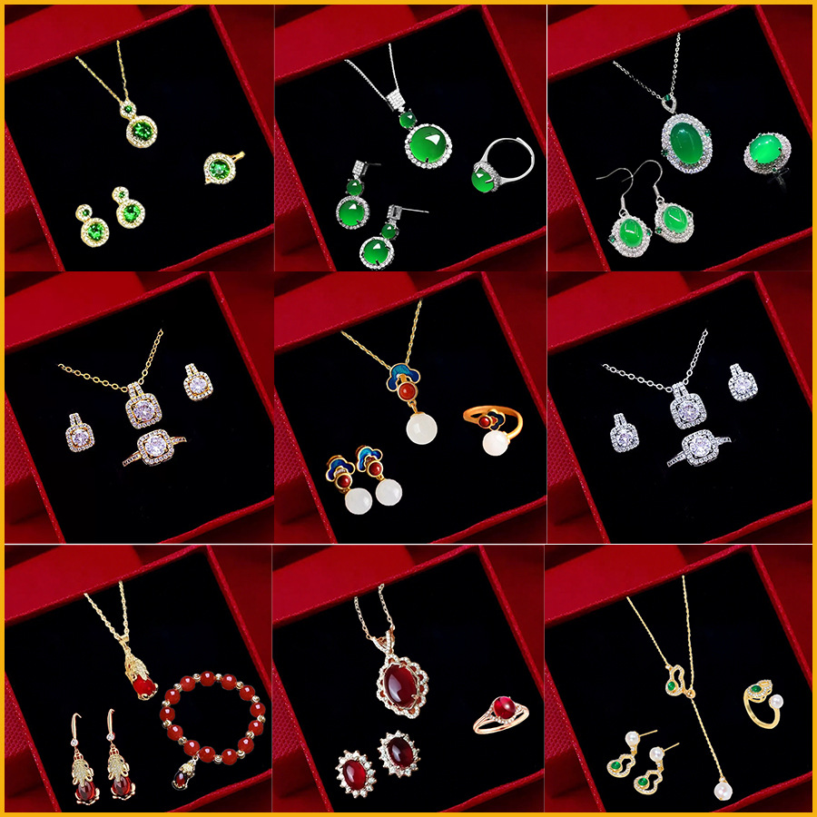 Chinese Style Moissanite Three-Piece Set Earrings Ring Women's Pendant Jewelry Wholesale Necklace Tiktok Live Cross-Border Hot Item