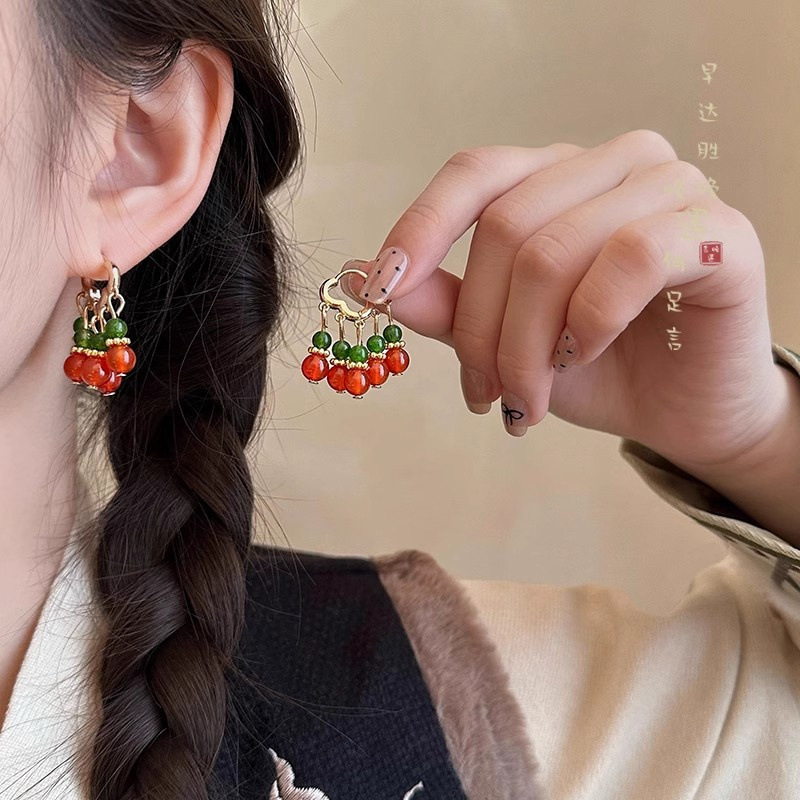 New Chinese Style Court Style Beaded Earrings Women's Light Luxury Retro High-end Ear Drops for Square Face Small Ear Buckle Earrings