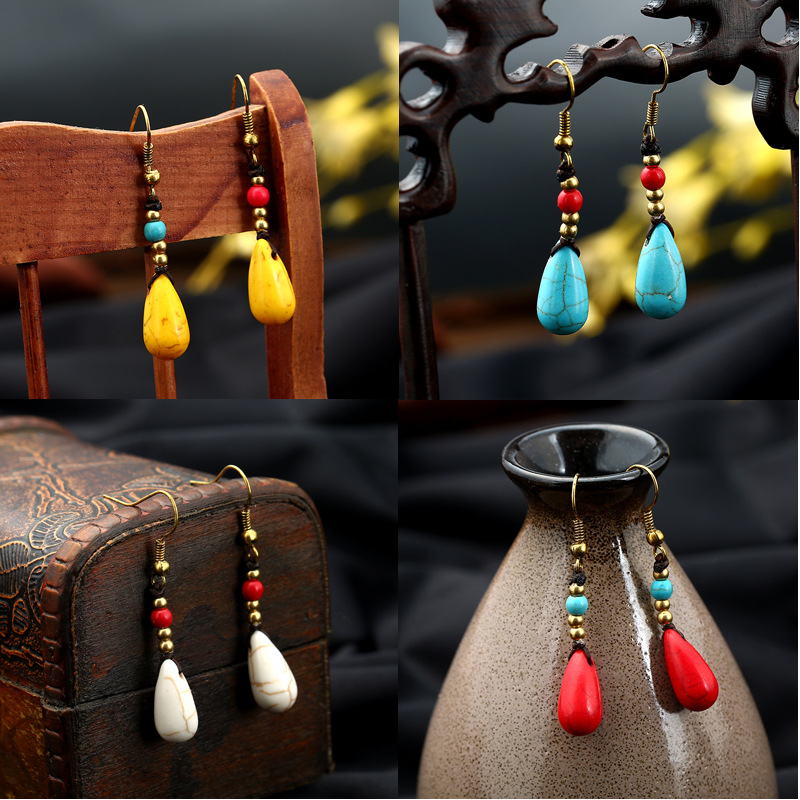 European and American Bohemian Jewelry Simple Earrings Vintage Semi-Precious Stone Water Drop Pendant Hand-woven Earrings