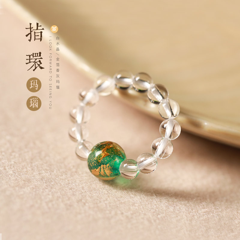 Design Fragrant Grey Gold Foil Glaze Beaded White Crystal Ring Elastant Line Ring Sweet Small Fresh Joint Ring