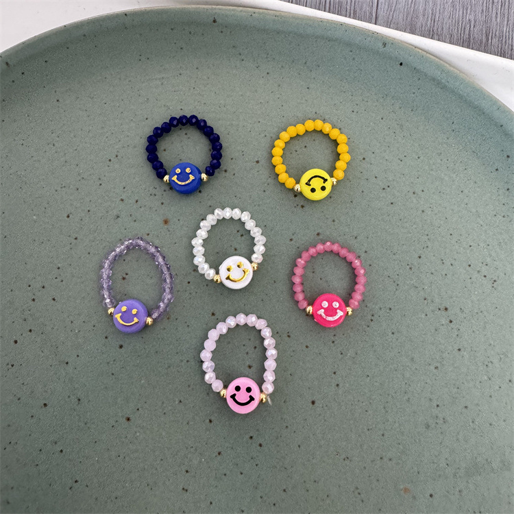 Dopamine Colorful Smiley Beaded Ring Women's New Color Contrast Hollow Crystal Hand-woven Ring Food Finger Ring