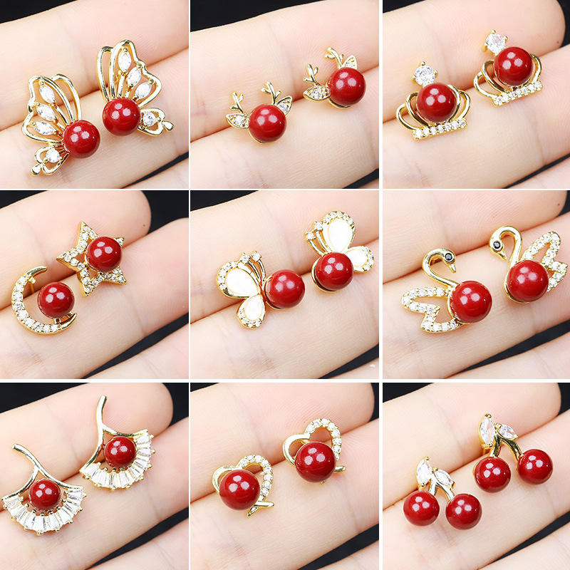 Natural High-Content Gold Sand Inlaid Earrings Cherry Cinnabar Swan DIY Earrings for Women New Year Best Friend Gift Earrings