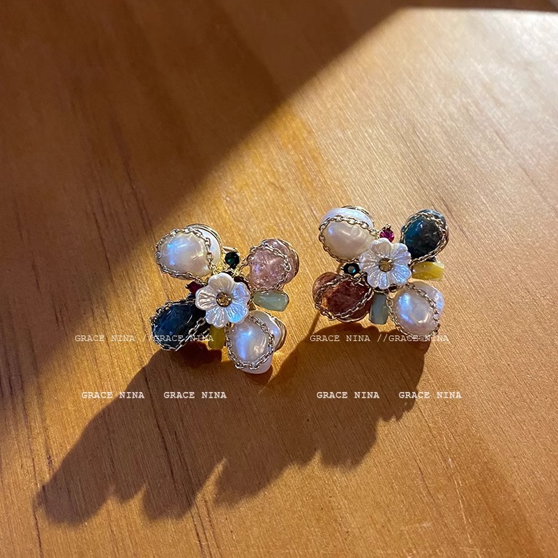 Hong Kong Style Vintage Baroque Pearl Flower Earrings Women's French Style Light Luxury High-end Court Style Exquisite Earrings Earrings
