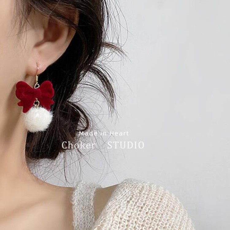 Vintage Wine Red Flocking Bow Hair Ball Earrings Winter Earrings Light Luxury Ear Clip Without Ear Holes Velvet Earrings Women