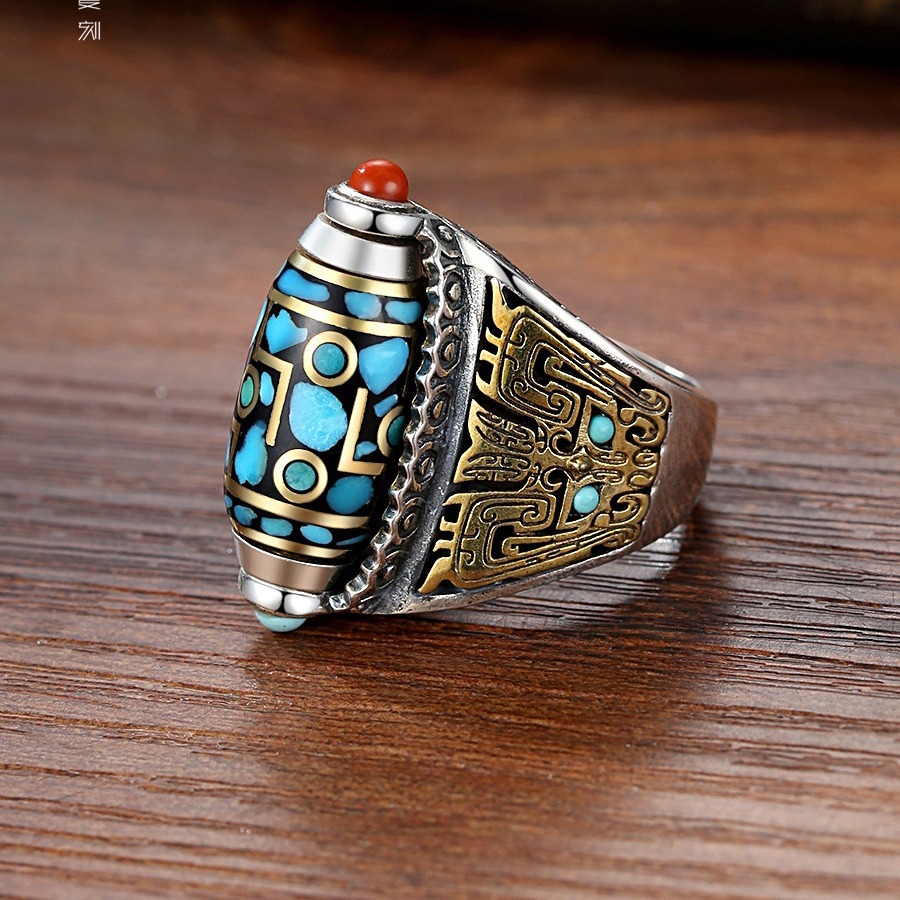 New Nine-eye Tianzhu Six-character True Words Turn Sports Ring Men's and Women's Handmade Retro Do Old Domineering Ring