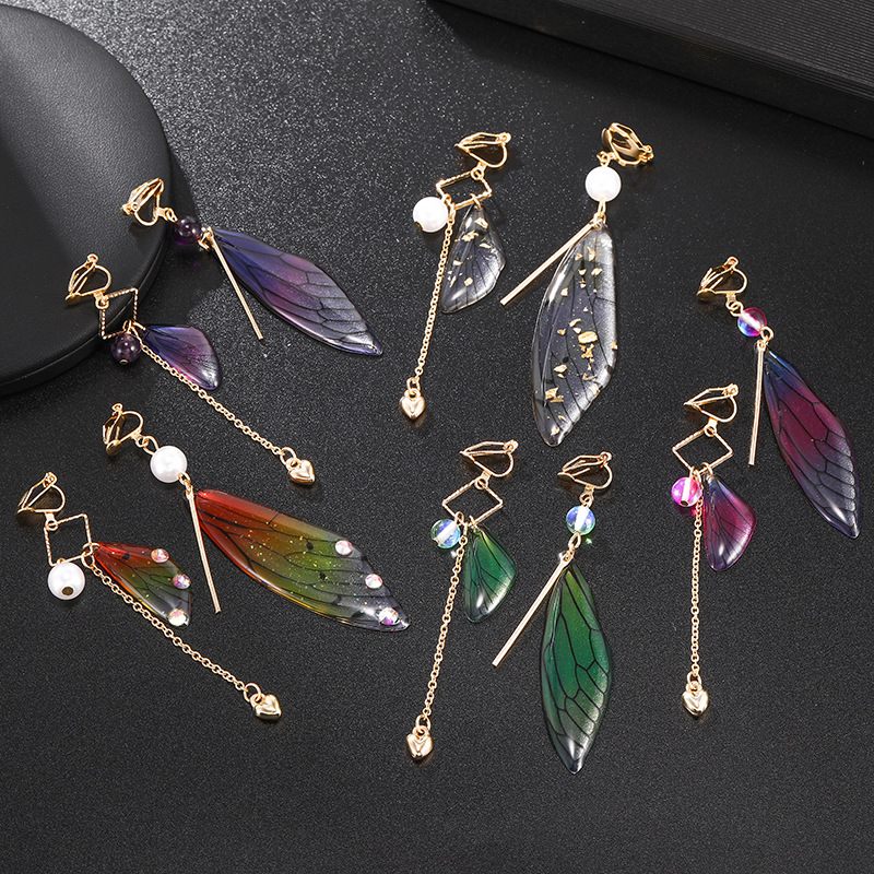Fashion butterfly wings resin earrings temperament long asymmetrical no ear hole ear clip gradient cicada wing earrings wholesale