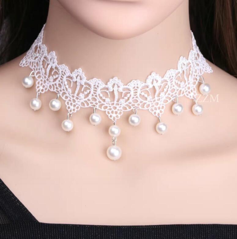 South Korea Vintage Super Fairy White Lace Pearl Pendant Collar Choker Sweet and Gentle Short Neckband Clavicle Chain