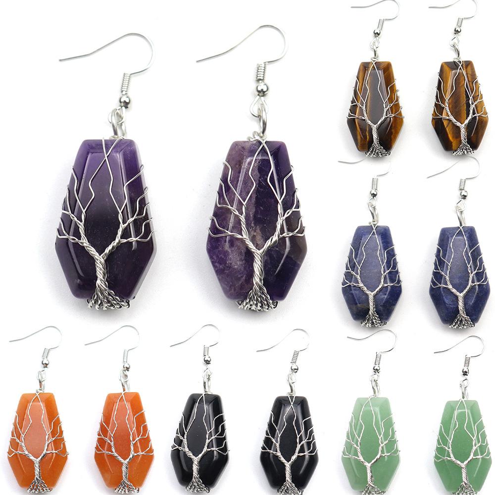 Amazon new handmade silver winding life tree natural stone crystal agate coffin earrings earrings E23