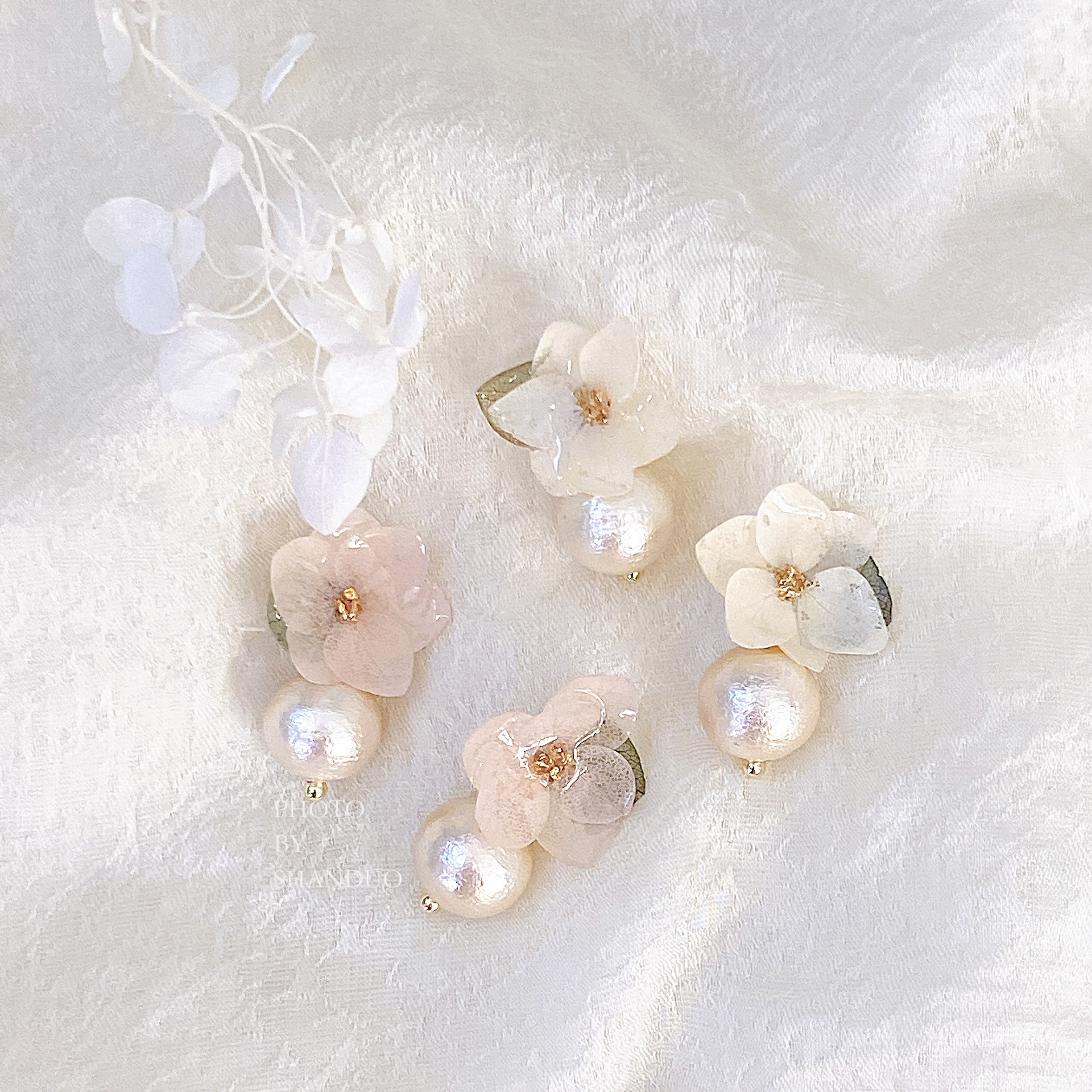 DIY Handmade ~ Glue Hydrangea Earrings Niche Design Real Flower Earrings High-End Cotton Bead Elegant Earrings