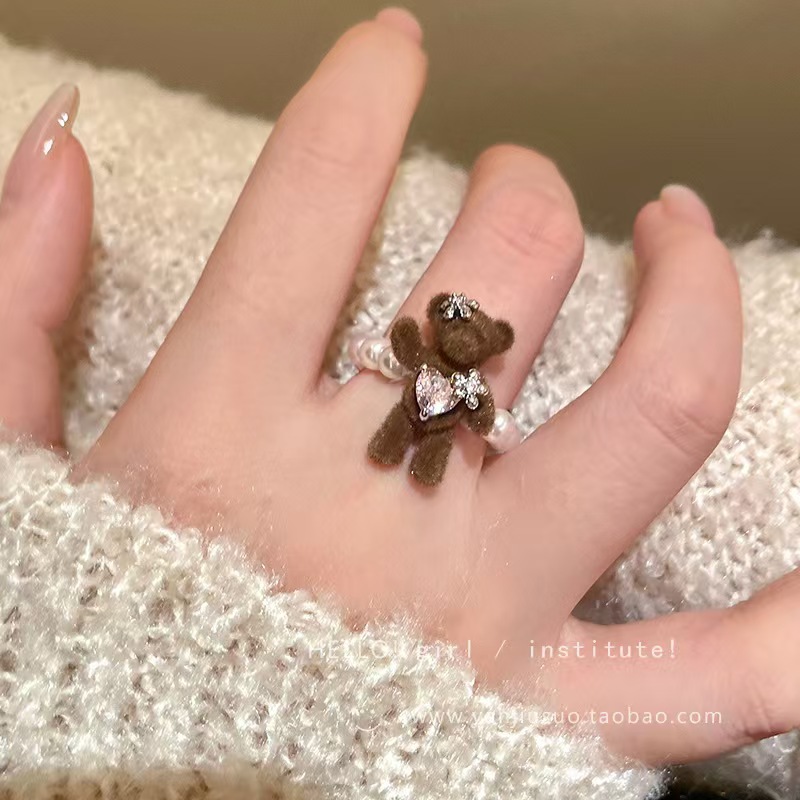 Cute Brown Flocking Bear Pearl Bear Flocking Ring Niche Personality Childlike Grotesque Fashion Unique Fingers