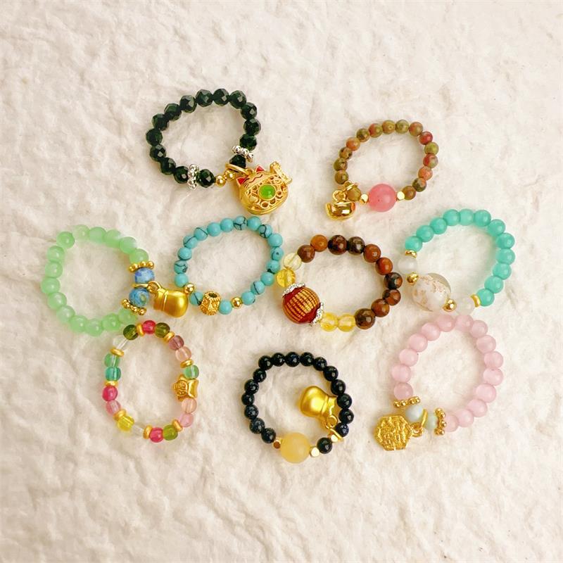 Large Round Bead Tourmaline Beaded Ring suit Women's Retro Ethnic Style Elastiness Rope Finger Ring Advanced Sense Simple Ring