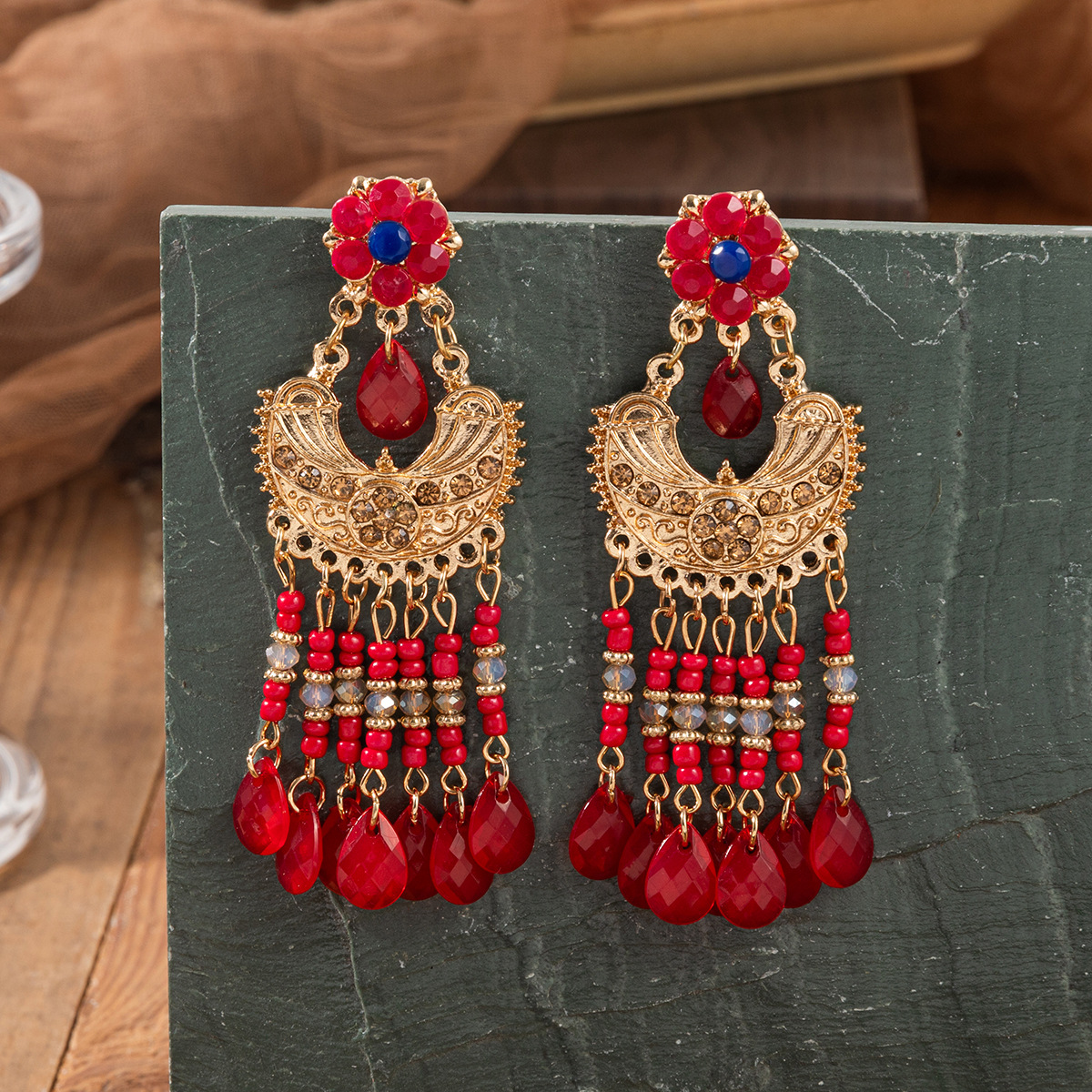 Indian Bead String Tassel Earrings with Exaggerated Stylish, Retro Flower Shape Handmade Beads and Rhinestone Earrings for Women