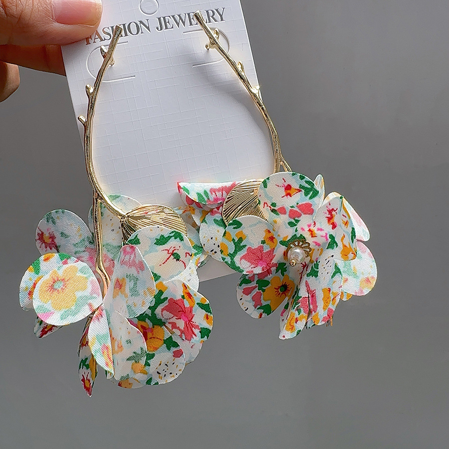 Bohemian Branch Fabric Flower Pearl Tassel Earrings Exaggerated Holiday Style Earrings Niche High-End Earrings