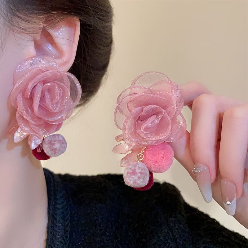 Bean Sha Powder Begonia Mesh Flower Hair Ball Earrings Autumn and Winter Earrings Niche Design Gentle Temperament Earrings Earrings