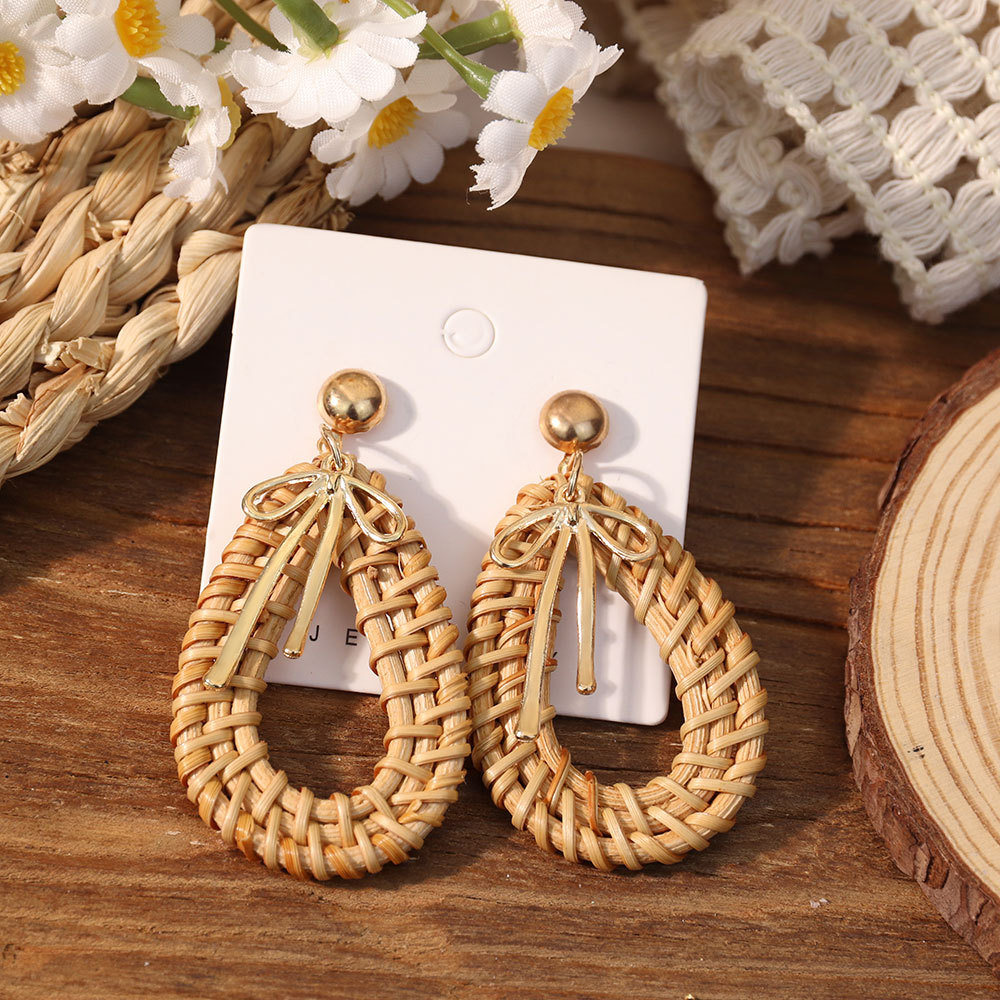 Retro Wood Color Rattan Earrings for Women Ins Style Niche Bow Earrings Bohemian Style Earrings Trendy Wholesale