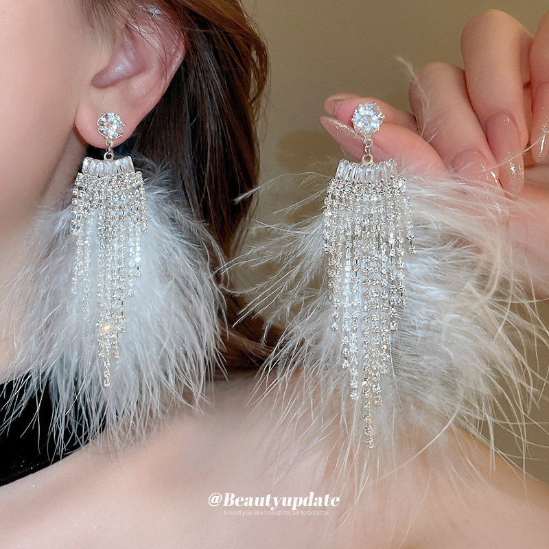 Super Fairy Long Diamond-encrusted Feather Tassel Earrings Temperament Atmosphere Ear Drop Escape Princess Style Advanced Ear Headwear Women