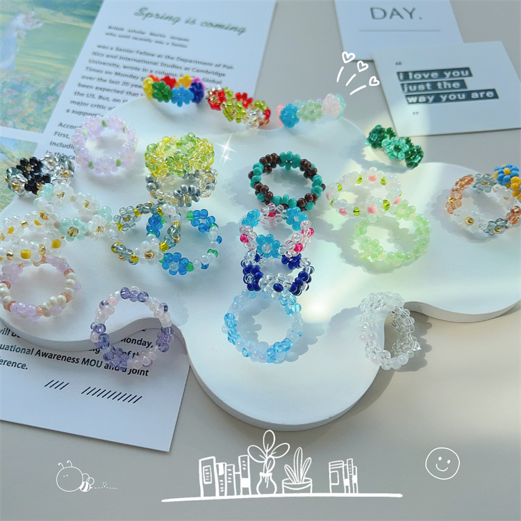 New Korean-style Niche Colorful Beaded Beaded Ring Flower Personality INS Style Elegant Design Finger Ring for Women