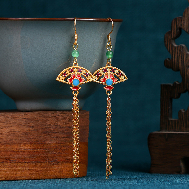 Ethnic style personalized handmade earrings niche high-grade fan tassel earrings ancient gold-plated new Chinese cheongsam earrings