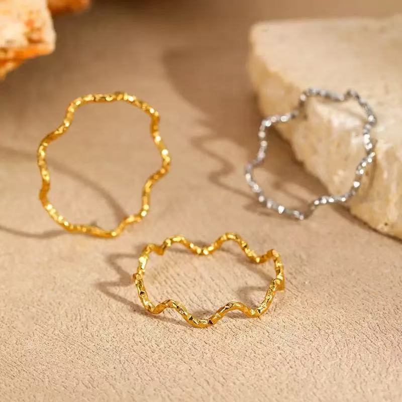 Titanium Steel Light Luxury Ultra-Fine Wave Ring with Textured Pattern, Knuckle Ring, Plain Band, 18K Gold Plated Ring for Women, Exquisite