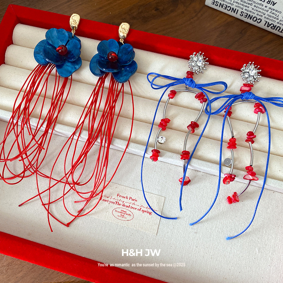 Silver Needle Acrylic Flower Braided Rope Tassel Earrings Hong Kong Style Retro Elegant Earrings Niche High-End Earrings for Women