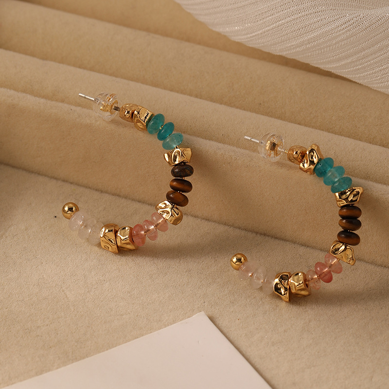 New C-Shaped Colorful Natural Stone Beaded Earrings Korean High-End Niche Retro Accessible Luxury 925 Silver Needle Earrings for Women