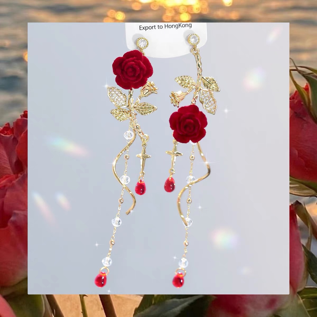 Love Song Red Rose Asymmetric French Retro Super Fairy Tassel Silver Needle Earrings Niche Advanced Ear Clip