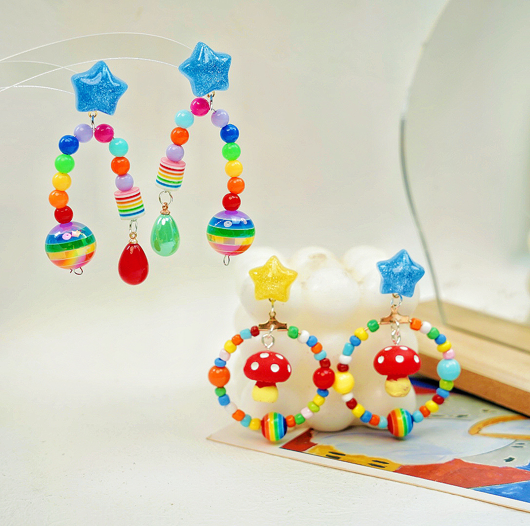 Retro colorful ins style handmade beaded earrings 925 silver cute mushroom Girl star resin earrings for women