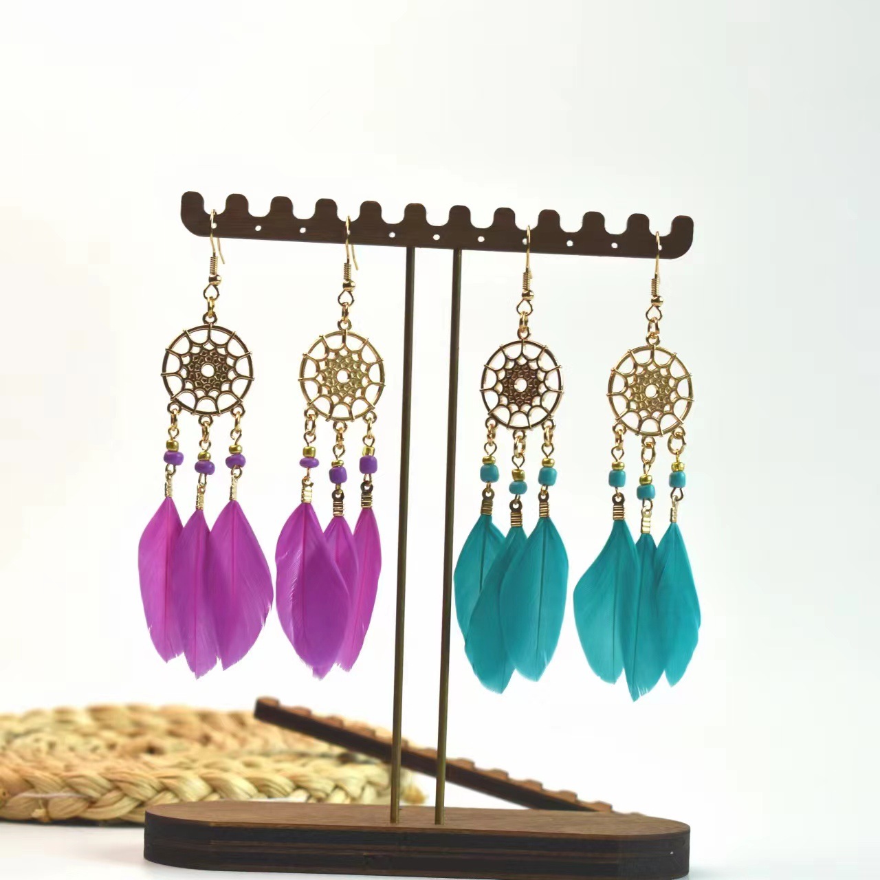 E-commerce Hot New Bohemian Ethnic Style Feather Earrings Long Bead String Holiday Feather Earrings