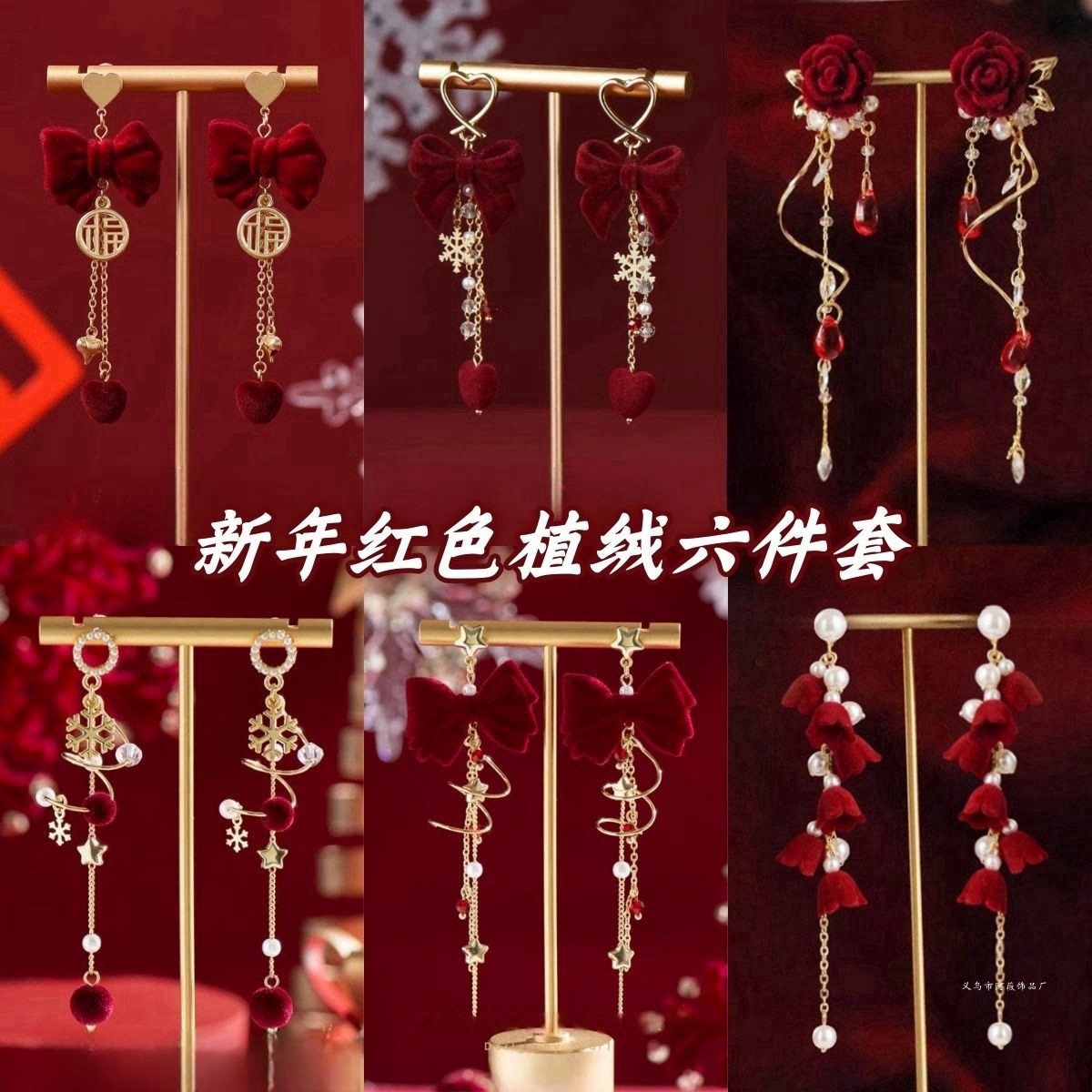 2025 autumn and winter red flocking bow lucky earrings New Year festive earrings niche design ear jewelry