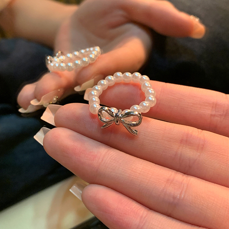 Bow Pearl Beaded Ring Women's Ins Niche Design Decorative Index Finger Ring Accessible Luxury High-End Stacking Ring