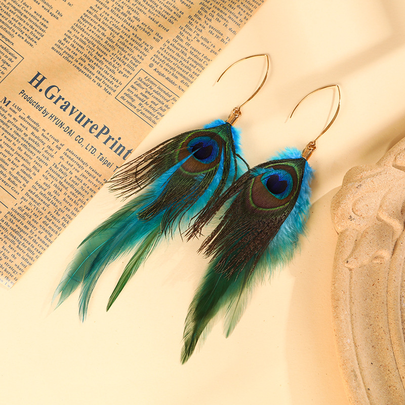 Cross-Border Bohemian Feather Earrings, Retro Exaggerated Long Ethnic Style Holiday Earrings, Autumn and Winter Peacock Earrings for Women