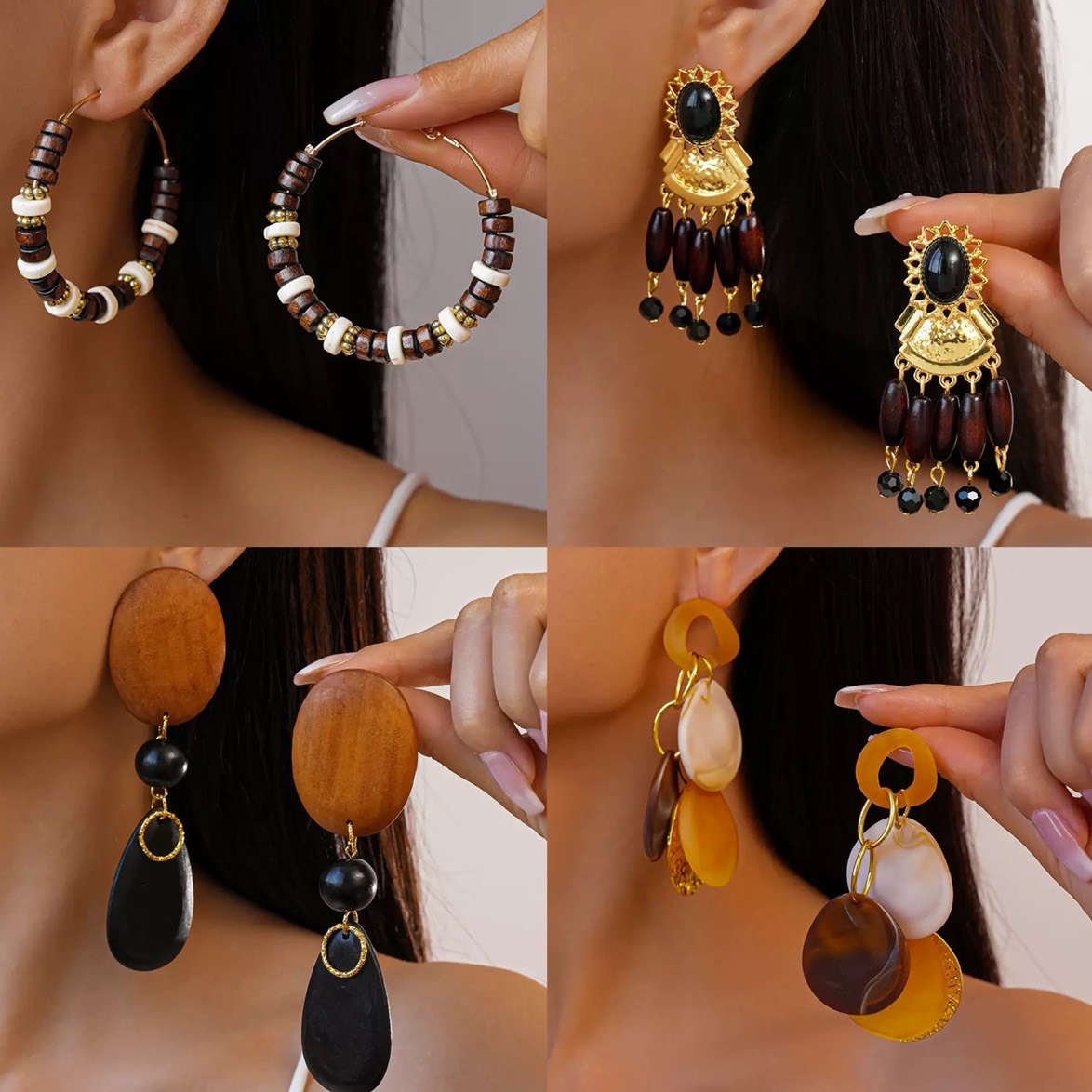 European and American Cross-Border Coffee-Colored Wooden Beads Beaded Water Drop Tassel Earrings Accessible Luxury High-End Earrings Retro Ethnic Style Earrings