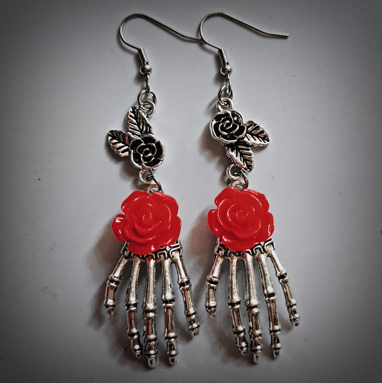 European and American new skull hand Red Rose Gothic gift handmade earrings Halloween earrings vintage jewelry
