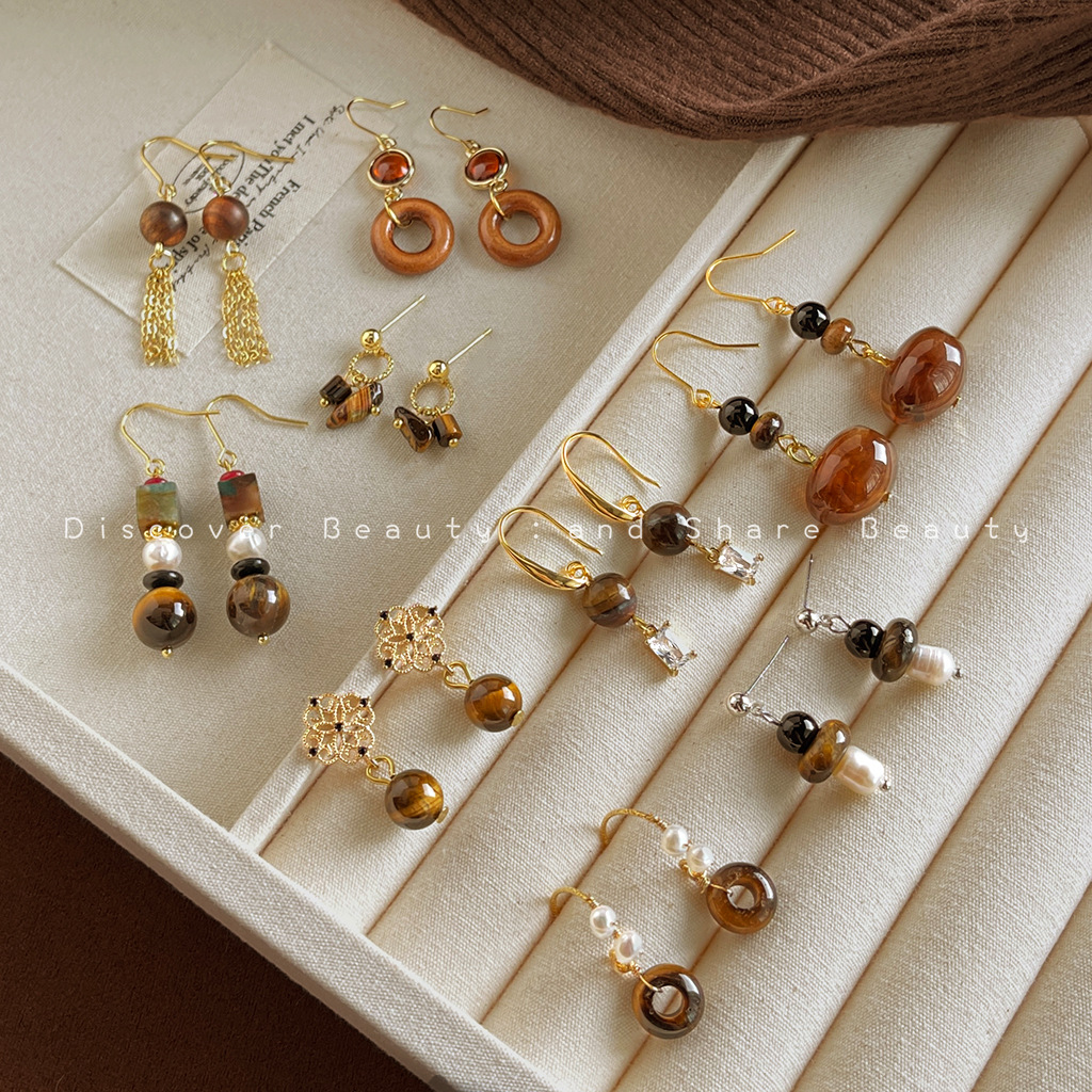 Autumn and Winter Maillard Tiger Eye Stone Earrings with Micro-Inlaid Zircon, Handmade Freshwater Pearl Studs, Artistic Retro Earrings for Women