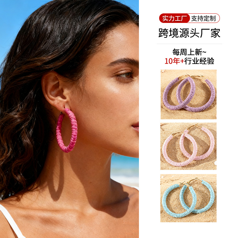 Bohemian Resort Style Raffia Hoop Earrings, Ins-Style Exaggerated Wire-Wrapped Earrings, Cross-Border Supply