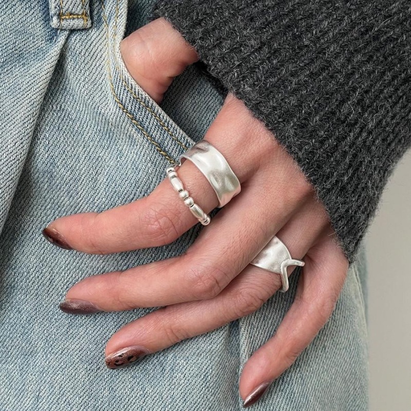 Exquisite double layer beaded ring women's geometric wide edge irregular hollow S925 silver plated open finger ring food finger ring tide